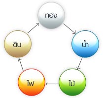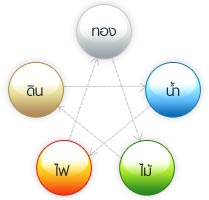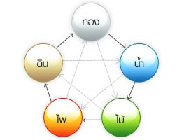 1. ธาตุทอง กำเนิด ธาตุน้ำ 2. ธาตุน้ำ กำเนิด ธาตุไม้ 3. ธาตุไม้ กำเนิด ธาตุไฟ 4. ธาตุไฟ กำเนิด ธาตุดิน 5. ธาตุดิน กำเนิด ธาตุทอง